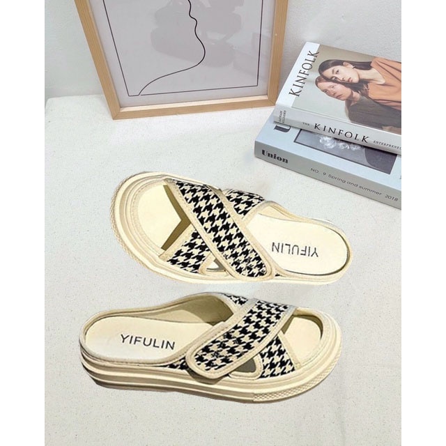 Giới thiệu Dép Bánh Mì Nữ Quai Chéo 3 Màu Đế Cao - Dép Sục Vải Nữ Hở Mũi Caro Đen