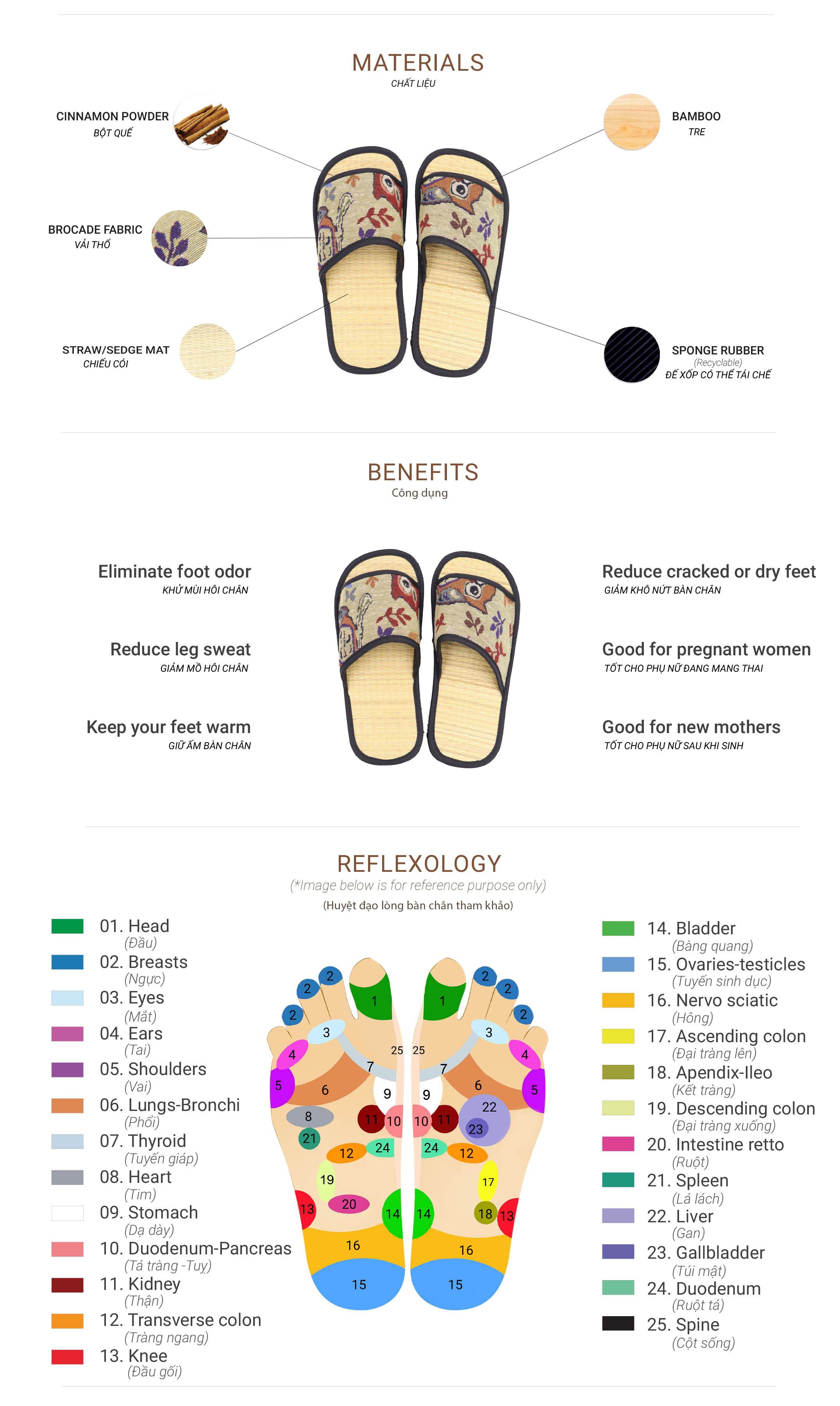 We bring traditional Vietnamese products to modern life all over the world. We offer the slippers that are eco-friendly and healthy with natural materials such as: Straw (or Sedge) mat, Bamboo, Wood and Cinnamon (cassia) powder insoles, keep the slippers fragrance of Cinnamon, supporting so many great benefits for your feet and foot reflexology.
