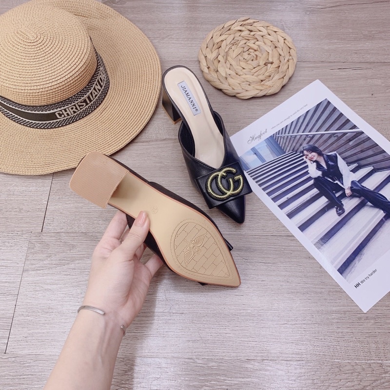Giày Dép Nữ > Giày cao gót || DL15 - Sục da lì mũi nhọn gót vuông 5p nơ vuông to CG( Ảnh kèm video)