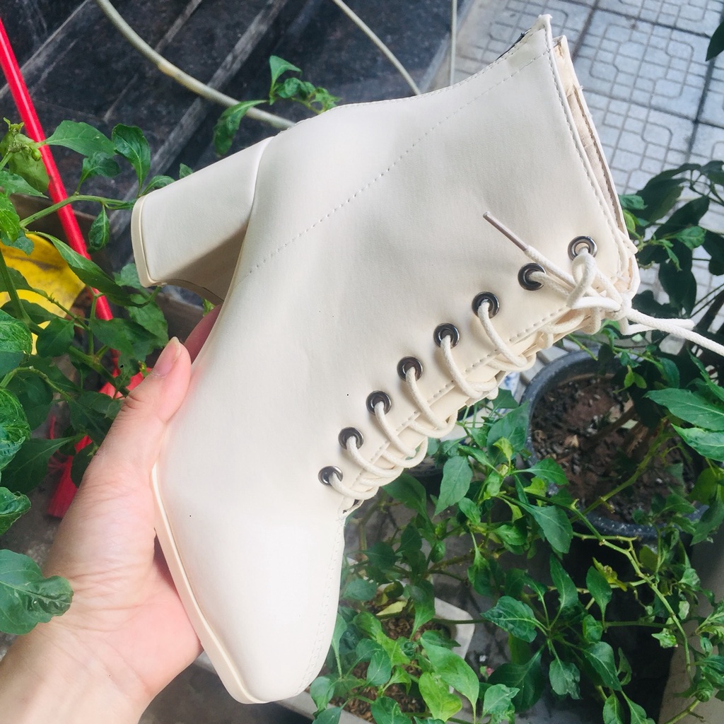 Giới thiệu Giày Bốt Nữ Cổ Lửng Buộc Dây Có Khóa Sau Gót Vuông Cao 7cm Cực Tôn Dáng