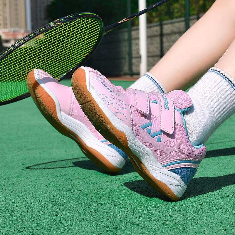 Giới thiệu Giày cầu lông trẻ em Lefus 1086 hồng nữ tính, da PU bóng, lưới thoáng khí, ôm chân, bám sàn, kèm quà tặng