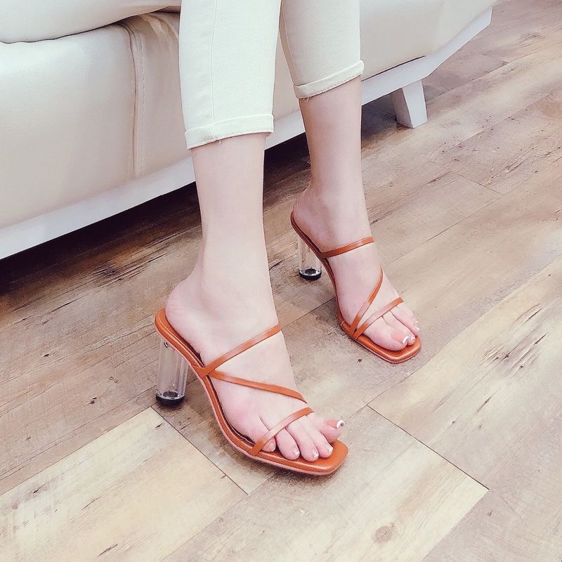 Giày Dép Nữ > Giày cao gót || Guốc da dây mảnh chéo gót trong