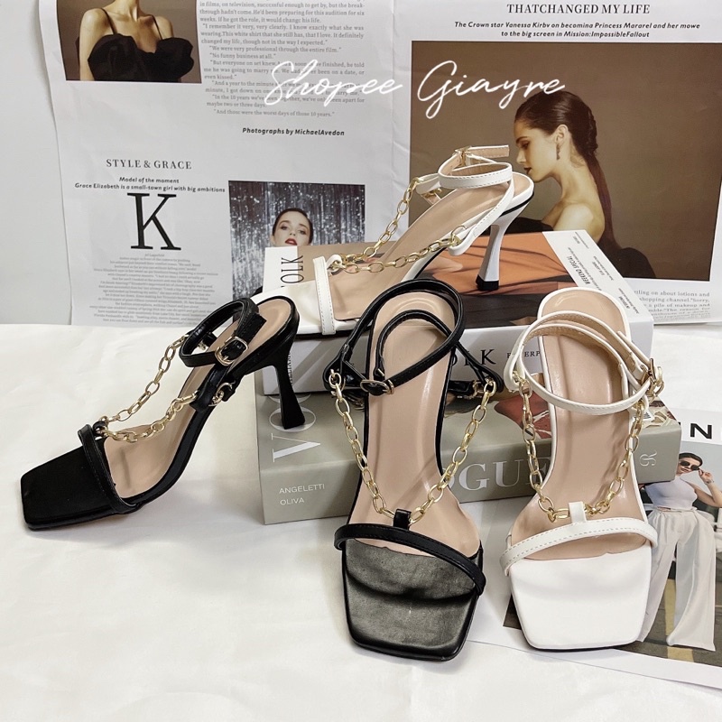 Giày Dép Nữ > Giày cao gót || Sandal dây mảnh phối dây xích nhỏ gót 7 phân (hàng đẹp)